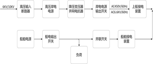 系統通過岸邊接電箱及柔性電纜將電源送至船舶接電裝置。最后通過船上的并網裝置實現與船舶輔機的并網,接入船用電系統供全船設備使用。當并網成功后,船舶輔機與岸電電源將自動實現負載轉移,最終船舶輔機停運、船用電氣設備完全由岸電電源供電。