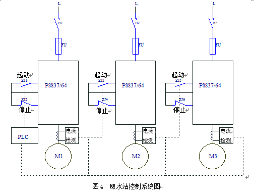 考慮到取水站無人值守,選擇啟動設備時著重可靠性,就選用軟啟動器,每臺水泵配1臺,共3臺。沉淀池內設有“高”、“中”、“低”3個水位點,用PLC根據沉淀池水位的高低來決定1臺水泵運行或2臺水泵運行,還可通過編程控制使3臺水泵使用的時間盡量相同。水泵的運行信號、故障信號通過電纜送到水處理站顯示。取水站的抽水水位比水泵安裝位置低2米,水泵初次起動或停止后再起動,都可能形成“真空”而吸不上水,原來的方式是靠人工注水。無人值守后必須自動地完成注水排氣這個過程,其方法是采用間接檢測方式,即檢測水泵電機的運行電流。如果管道有“真空”,則電機近似于空載運行,電流較小;如果管道沒有“真空”,則電機接近滿載運行,電流基本上為額定電流,二者的差值較大。用電流檢測來確定電機或抽水管道有無真空,如有問題,PLC給出報警信號,通知值班人員處理。