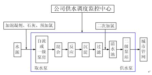 根據供水范圍及使用居民人數,確定自來水廠日供水量能力。不同大小的自來水廠,其生產工藝流程基本相同,包括水源、取水、混合、反應、沉淀、過濾、消毒、給水等過程。生產工藝流程見下圖: