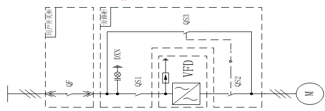 合QS3、分QS1、QS2為工頻模式。電機可由QF直接啟停并進行保護,變頻器可完全和電網脫離,便于維護與檢修。