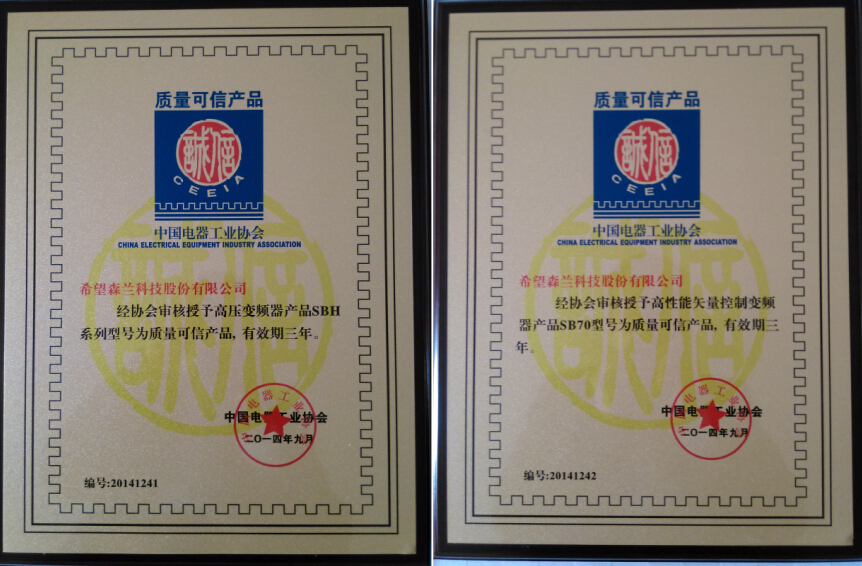 森蘭SBH系列高壓變頻器、SB70高性能矢量控制變頻器榮獲中國電器工業協會“質量可信產品”獎